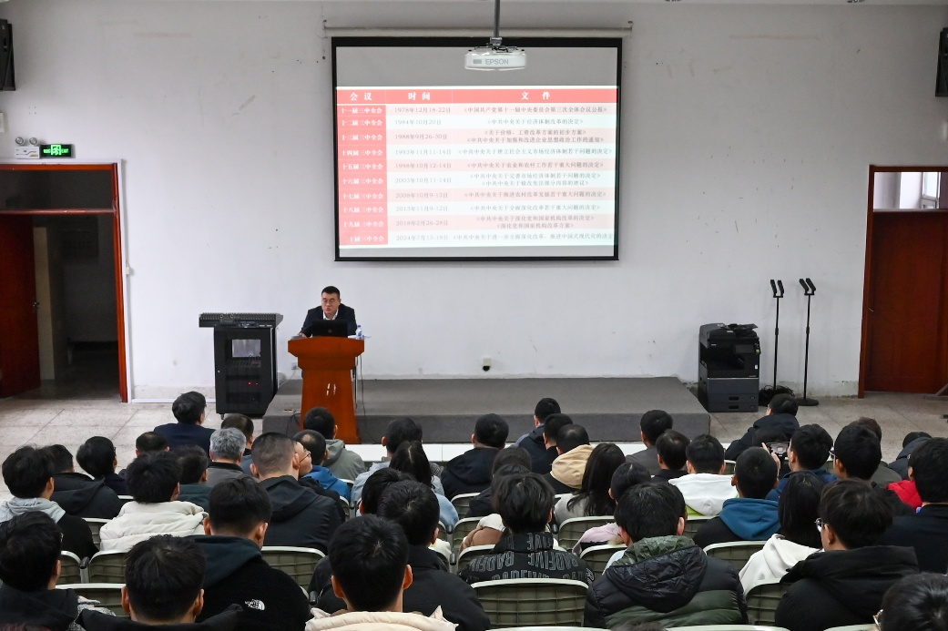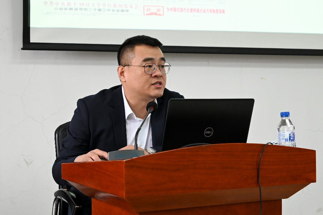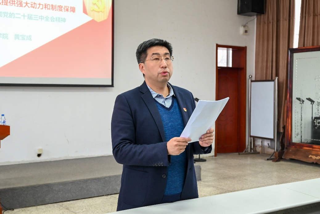 黄宝成以《为中国式现代化提供强大动力和制度保障——学习贯彻党的二十届三中全会精神》为题,从进一步全面深化改革的总体要求、进一步全面深化改革的系统部署、进一步全面深化改革的领导水平、学习贯彻党的二十届三中全会精神的学习体会等四方面做了详细解读,对全面理解和准确把握党的二十届三中全会精神的丰富内涵具有重要指导意义,为学院师生党员深入学习领会党的二十届三中全会精神打下了坚实的基础。