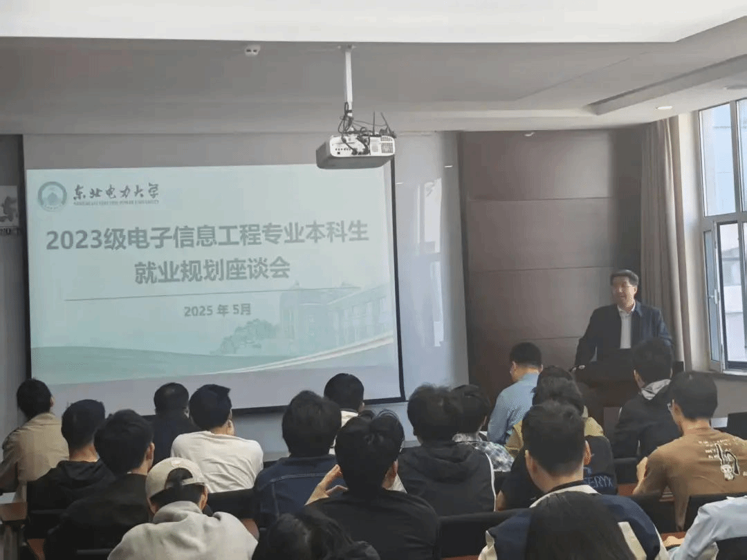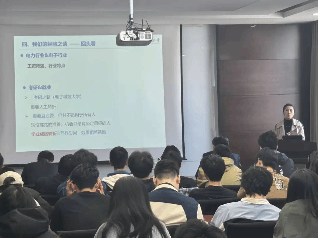 会上,杨茂首先以2025年全国毕业生就业形势的分析为切入点,围绕近三年电子信息工程专业发展前景和就业数据的分析与会学生交流。他指出:要充分认识当前的就业形势,尽早明确个人发展方向,以科创引领赋能,以勤学笃学夯基,以自身实际行动为大学生活交上一份满意的答卷。随后,张薇结合自己的求学经历和研究生同学调研结果,对学生普遍关心的就业抉择、个人发展和能力提升路径等问题一一解读。段双明围绕电子信息工程专业十个就业领域所需技能开展交流分享。最后,杨修宇对部分重点科创赛事予以讲解并积极动员。