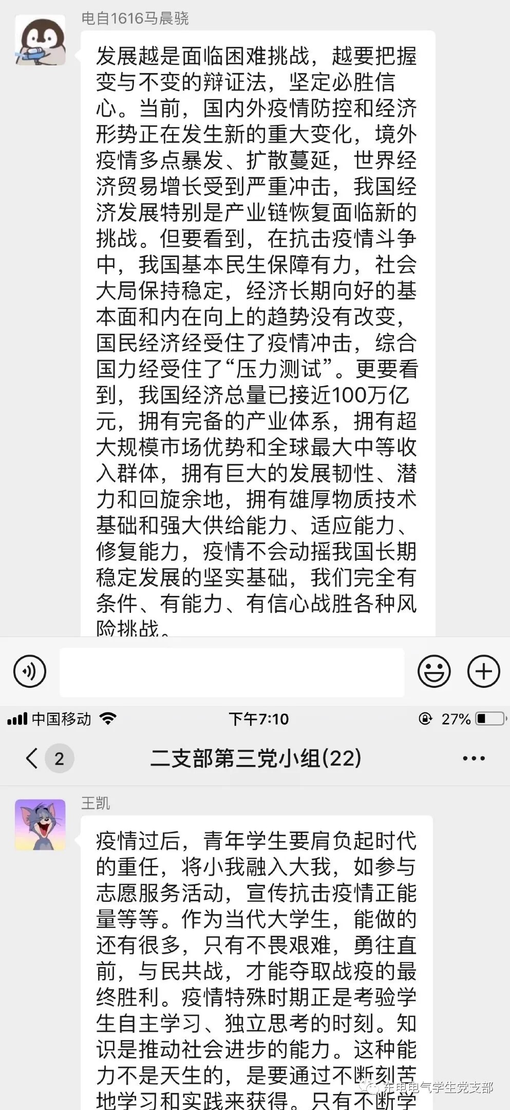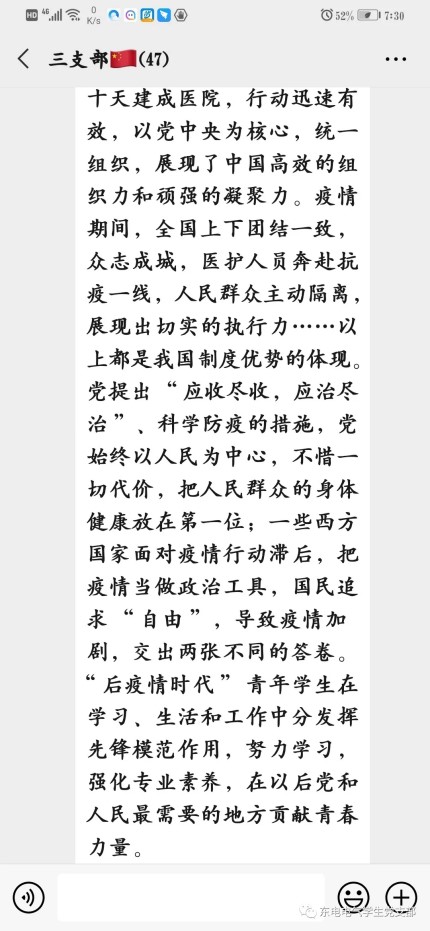 大家普遍认为,‘后疫情时代’世界形势新的变化,青年学生应树立大局意识,不传谣,不信谣,严格遵守国家和学校的防控要求,一切行动听指挥;勇于担当,积极作为,随时准备投身到学校开学各项志愿服务工作中去;珍惜时间,勤于学习,沉淀自己,调整身心状态,“为中华崛起而读书”绝不是过时的口号,中华民族伟大复兴的中国梦需要我们的聪明才智;坚定必胜信心,在党中央的坚强领导下,我们定会早日打赢疫情防控的人民战争、总体战、阻击战。