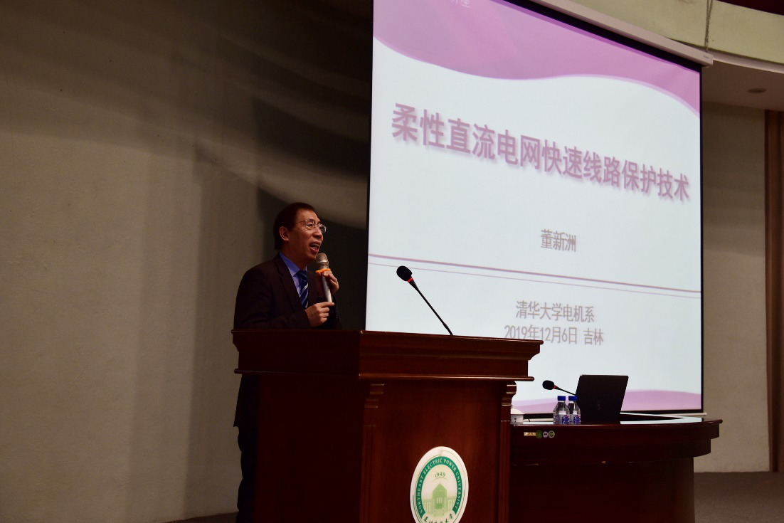 首先,董新洲教授做了题为《柔性直流电网快速线路保护技术》的学术报告,主要从建设柔直电网的背景、柔直电网线路保护特殊要求和柔直电网线路保护结构原理三个方面深入浅出地介绍了柔性直流电网快速线路保护的相关内容,还在传统电流差动保护存在的问题、短路电流的分布和对继电保护的需求等方面向师生们表达自己的见解。
