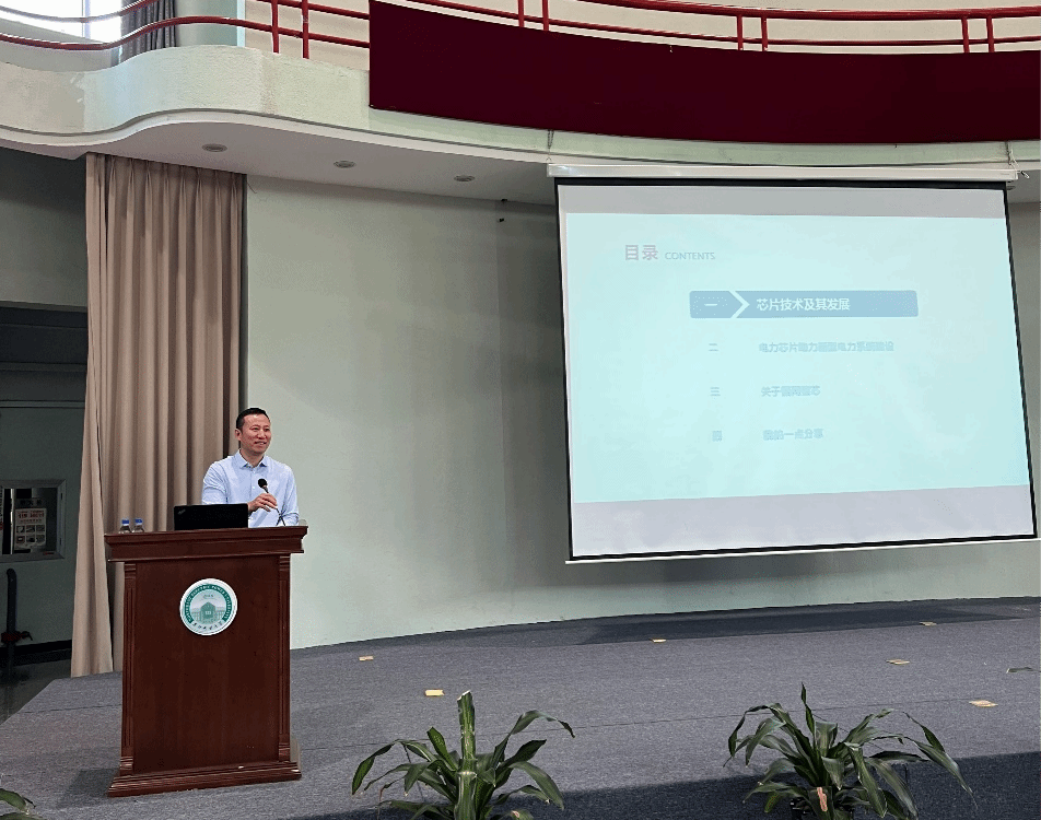 报告中,袁福生副总经理对新型电力系统可观、可测、可控所面临的挑战和芯片需求进行总结。在此基础上,袁福生副总经理分析了电力芯片的技术特点和亟待突破的关键技术难点,并围绕芯片产业链各环节的重点与难点,以电力应用为牵引,阐述了近年来电力芯片领域所取得的技术突破和成果。最后,袁福生副总经理从自己求学和工作的实际经历出发,分享了切身体会,寄语同学们要找准方向,明确人生目标,向着实现科研报国梦想不断奋斗。